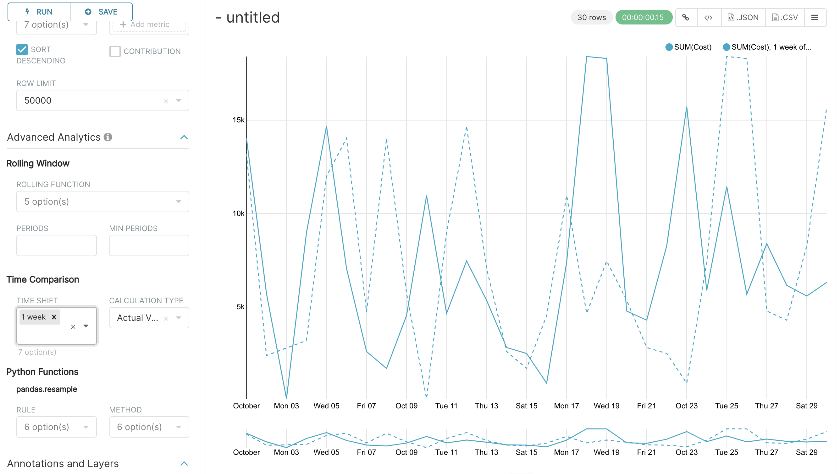 Next, in the Python Functions subsection of Advanced Analytics, enter 7D, corresponding to seven days, in the Rule and median as the Method and show the chart by selecting Run Query.